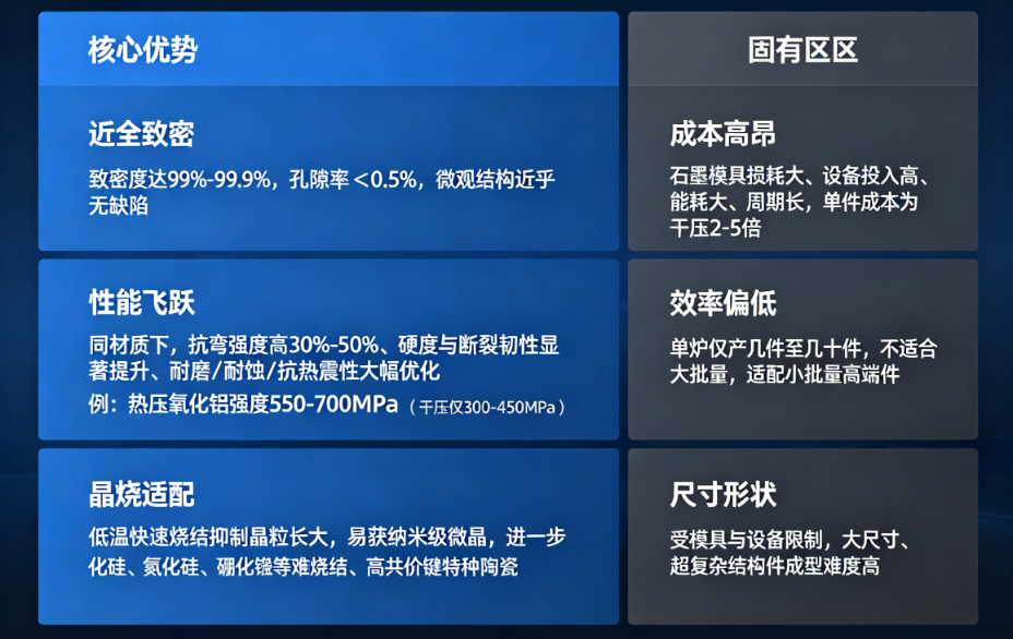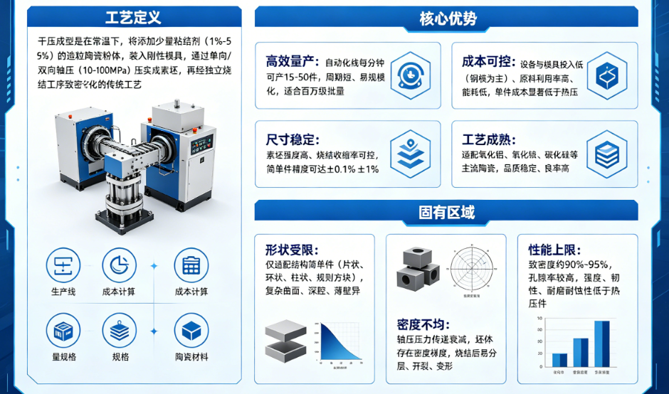1. 2 つの主要なプロセス原理と核となる特性の完全な分析1. 乾式プレス成形: 効率的な量産のための標準化された選択肢 2. 熱間プレス成形プロセス定義 ホットプレスというのは、 成形と焼結の一体化 先進技術: 真空・保護雰囲気 、高温に耐える型(主にグラファイト)に粉末を入れ、同時に塗布します。 高温(1400~2200℃) 高圧(20~40MPa) 、粉末は熱可塑性の流れの中で急速に緻密化され、ほぼ完全に緻密なセラミックが 1 つのステップで形成されます。 2. 乾式プレスと熱間プレス:コア寸法の比較表